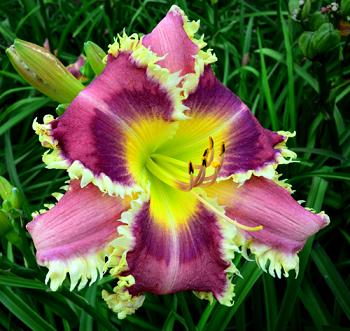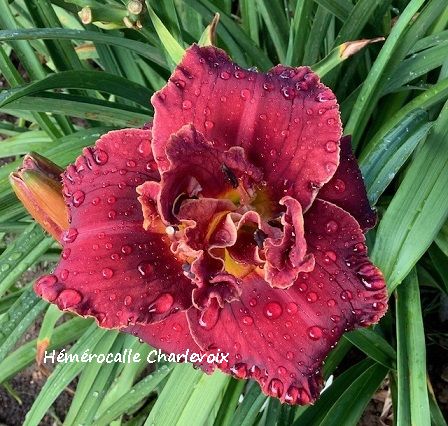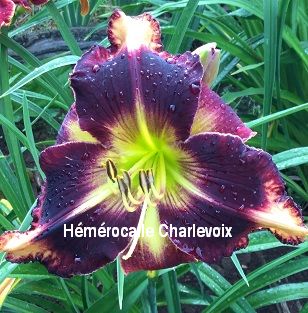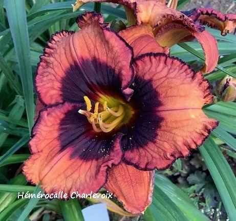 Grande fleur de couleur vin rouge avec oeil cratère rose crème, bordure blanche frisée, coeur vert. Florifère et fertile. |