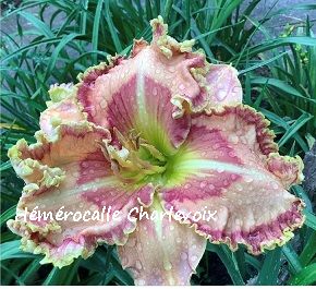 Grande fleur crème rose pâle avec œil et bordure rose. Double bordure dorée, coeur vert. Fertile dans les deux sens. |