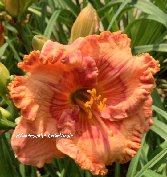 Fleur tangerine, halo et double bordure orange avec filigrane or, coeur vert. Fertile dans les deux sens. |