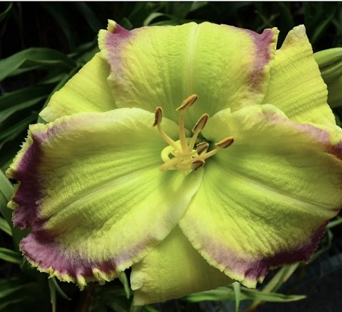 Fleur jaune, grand halo et bordure frisée rouge vin, coeur étoilé vert lime. Fertile. |