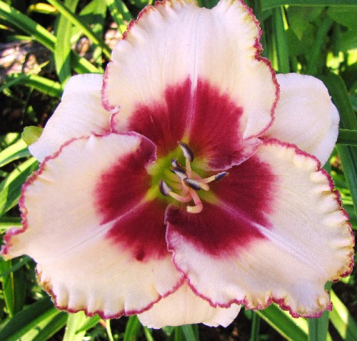 Fleur de forme pleine crème rosée, halo et bordure pourpe foncé, coeur vert. Fertile. |