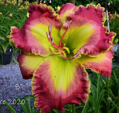 23 boutons floraux. Grande fleur lumineuse rouge rubis, halo rose, coeur et bordure chartreuse. Fertile. |