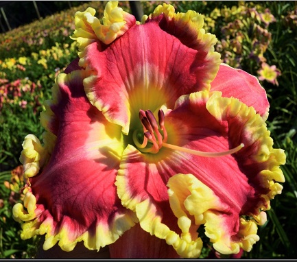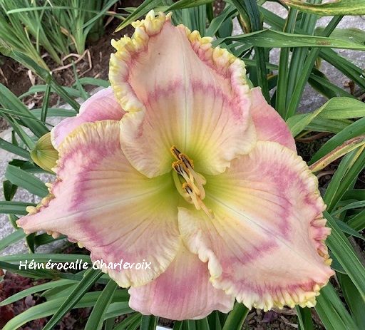 Admirable grande fleur rose soutenu, bordure frisée blanche, coeur vert. Florifère et fertile |