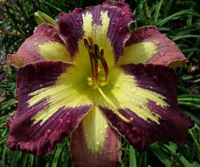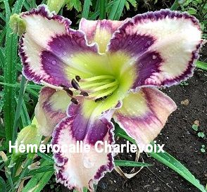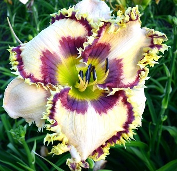 Hallucinante grande fleur crème, oeil et bordure pourpre, rebord des pétales blanc, coeur vert lime. Florifère et fertile. |