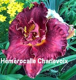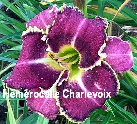 Magnifique fleur prune, oeil et bordure poupre et rebord frisé blanc, coeur vert. Florifère et fertile. |