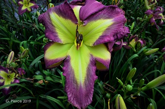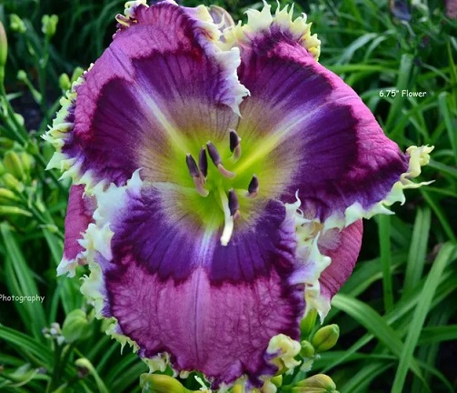 30-35 boutons floraux. Grande fleur pourpre avec halo et gorge verte à floraison répétée. Fertile dans les deux sens. |
