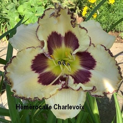 Grande fleur ivoire, oeil et bordure violacé foncé, coeur vert. Florifère et fertile.