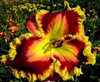 Fleur jaune pâle avec halo et bordure vin, cœur vert. Fertile. |