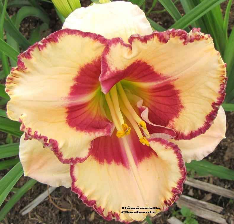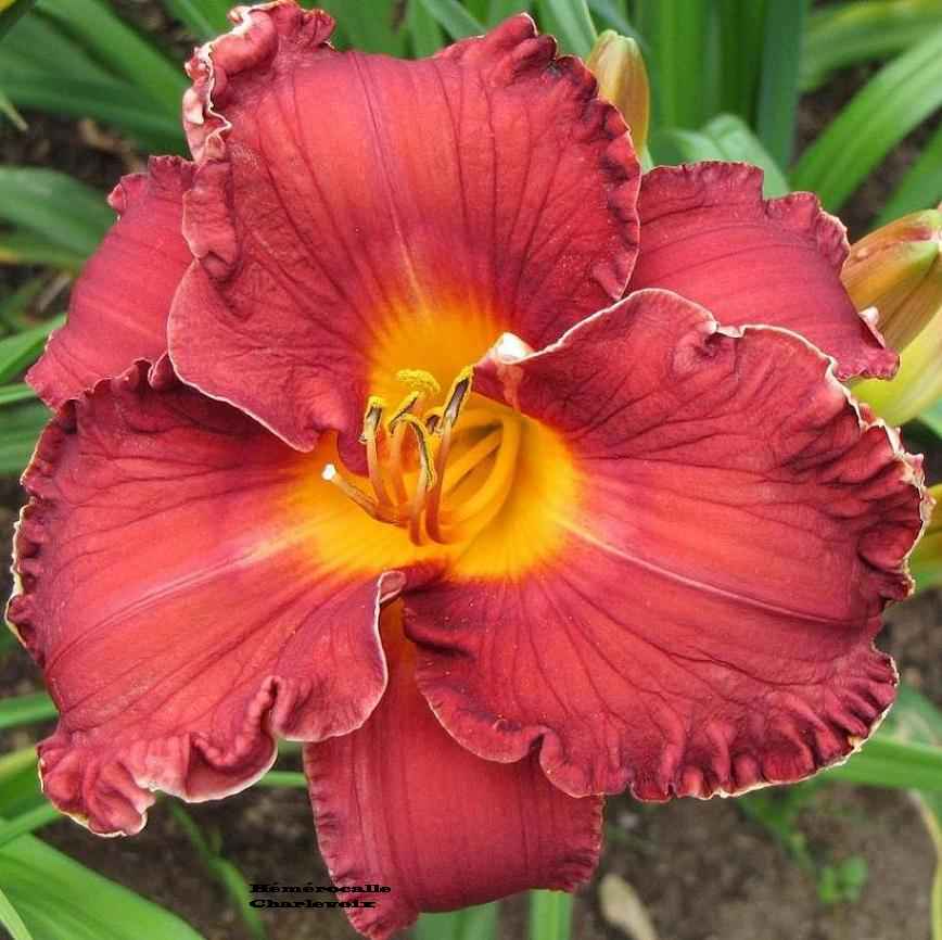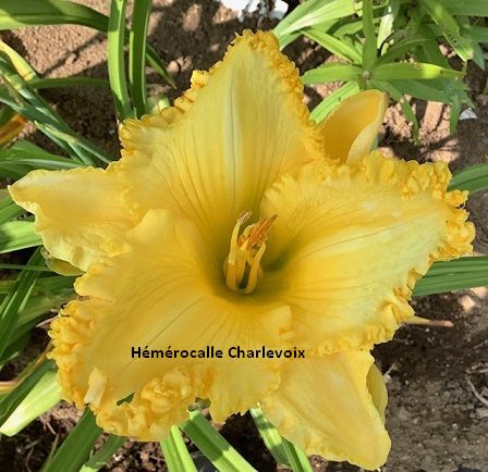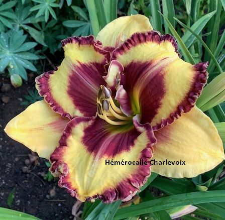 Fleur jaune intense, bordure frisée, coeur vert. Fertile dans les deux sens