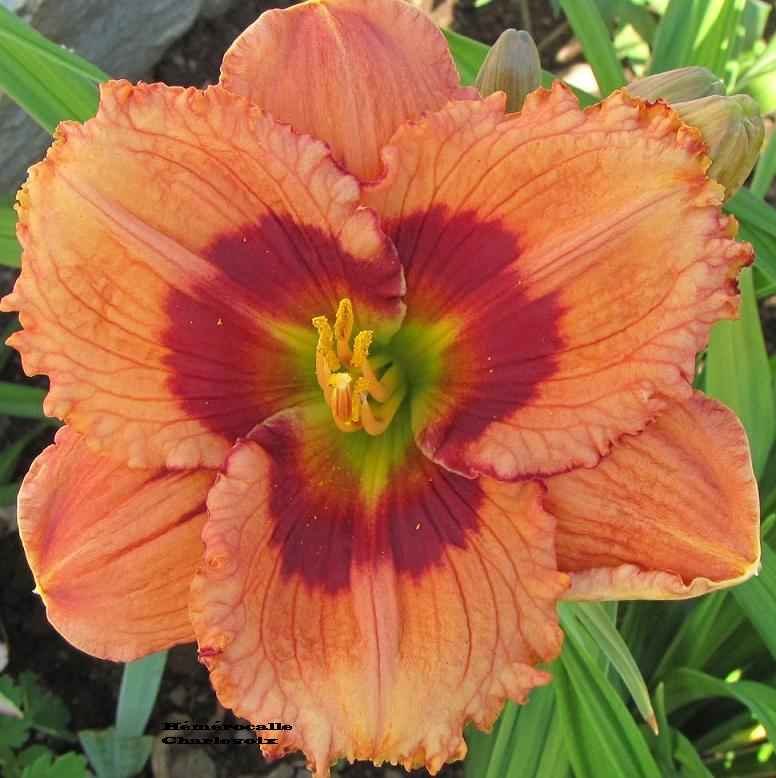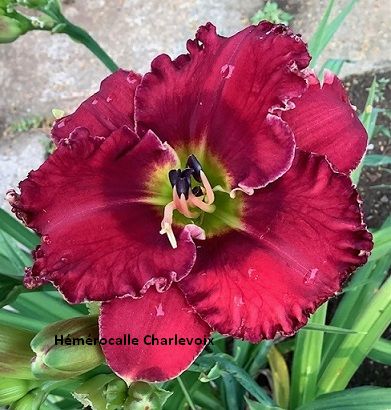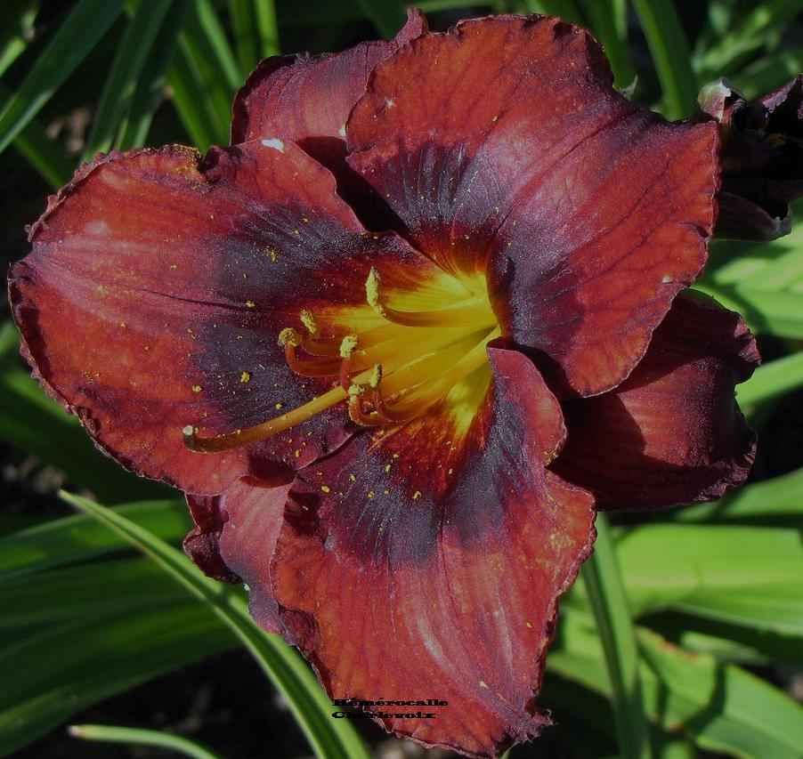 Grande fleur prune foncé, halo bourgogne très foncé, coeur étoilé jaune orangé et vert. Fertile