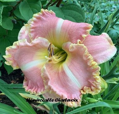 Superbe fleur rose, halo jaune, large bordure frisée dorée, coeur vert. Fertile dans les deux sens. GAGNANTE AAHQ 2025