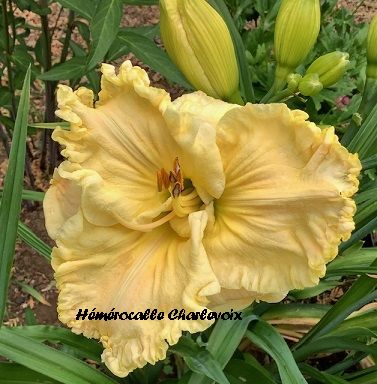 Fleur jaune pâle de texture fripée, forme pleine, coeur vert. Fertile