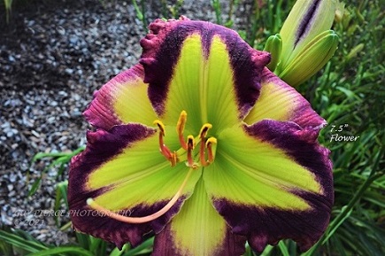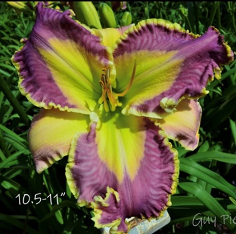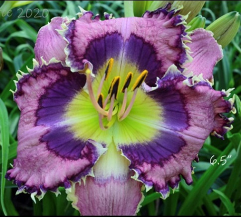 boutons floraux 35. Grande fleur lilas pourpre, oeil et double bordure pourpre avec dents blanches, coeur vert lime. Fertile. |