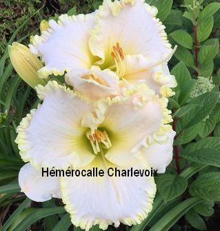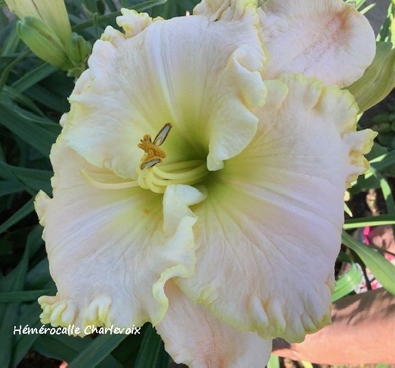 Magnifique fleur blanche avec reflets jaunâtres, bordure frisée jaune, coeur vert lime. Fertile. |