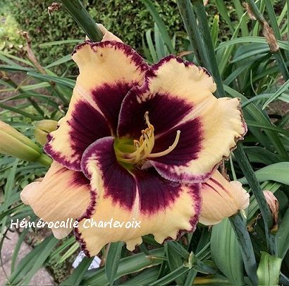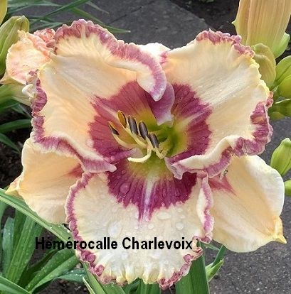 Fleur crème avec halo et bordure pourpre foncé, cœur vert. Très fertile dans les deux sens. |