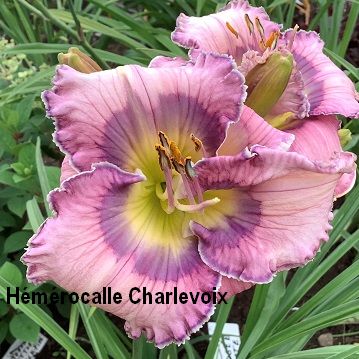 Fleur rose lilas, oeil et bordure dégradé lilas bleuté, coeur vert. Florifère et fertile. |
