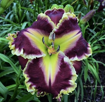 25 boutons floraux. Fleur combinée de dents avec un motif coloré en charbon de bois foncé et prune. La gorge est verte foncée, bordure avec tentacules blanches. Fertile dans les deux sens. |