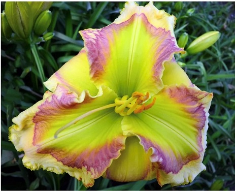 Grande fleur jaune avec bordure frisée, cœur vert. Fertile. |