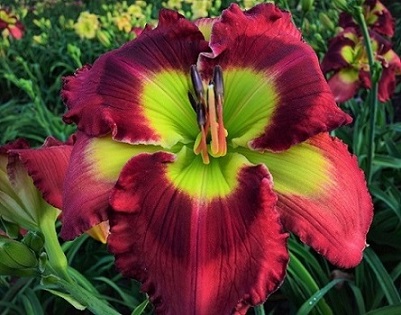 Hauteur 34, Fleur 7,5, Boutons floraux 35. Grande fleur rouge, oeil rouge foncé, double substance, gorge verte céleri, bordure frisée. Fertile. |