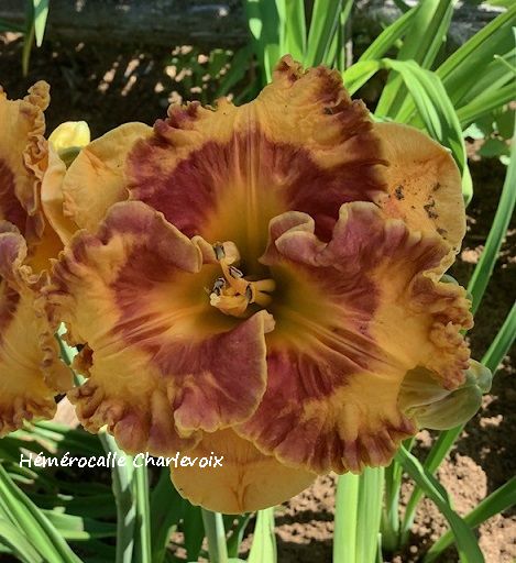 Fleur jaune orangé, halo plissé prune et double bordure frisée prune et or, substance épaisse, cœur vert. Fertile. |