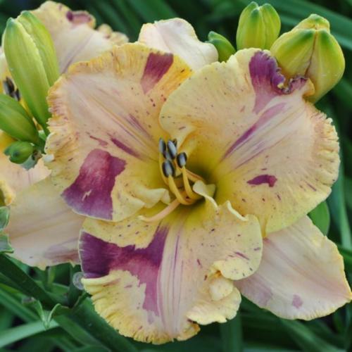Hauteur 30, Fleur 10-10,25 boutons floraux 30. Énorme! Base rouge raisin avec très grande gorge, centre vert d'environ 8,75, petites dents argentées, picotée rouge. Double substance et 100% diamant poussière!!! . Fertile dans les deux sens. |