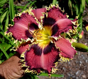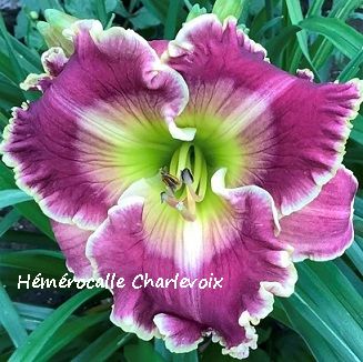 Grande fleur de couleur vin rouge avec oeil cratère rose crème, bordure blanche frisée, coeur vert. Florifère et fertile. |