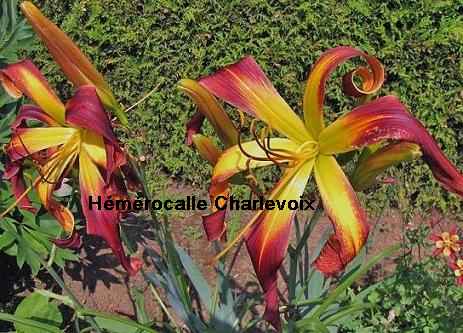 23 boutons floraux. Grande fleur lumineuse rouge rubis, halo rose, coeur et bordure chartreuse. Fertile. |