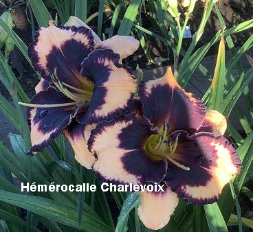Fleur de forme pleine crème rosée, halo et bordure pourpe foncé, coeur vert. Fertile. |