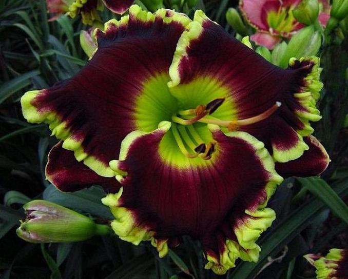 Hallucinante grande fleur crème, oeil et bordure pourpre, rebord des pétales blanc, coeur vert lime. Florifère et fertile. |