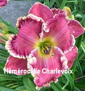 Admirable grande fleur rose soutenu, bordure frisée blanche, coeur vert. Florifère et fertile |