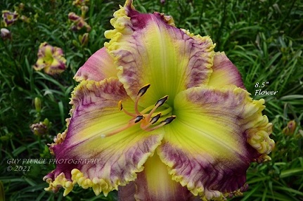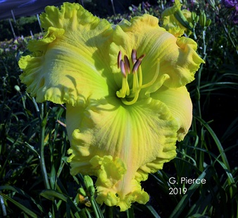 Hauteur 40, Fleur 8,75, Boutons floraux 35-40. Grande fleur de forme pleine jaune verdâtre, bordure très frisée, descendance de R.F.K. Fertile dans les deux sens. |