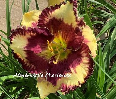 Fleur jaune pâle avec halo et bordure vin, cœur vert. Fertile. |