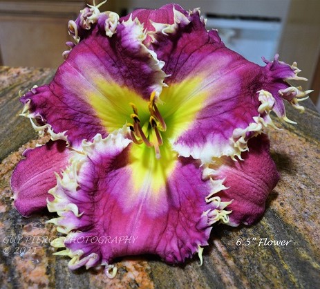 Grande fleur ivoire, oeil et bordure violacé foncé, coeur vert. Florifère et fertile.