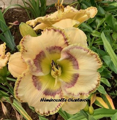 Grande fleur jaune crème avec halo fléché lilas, double bordure lilas et or, cœur vert. Fertile dans les deux sens.GAGNANTE AAHQ 2025