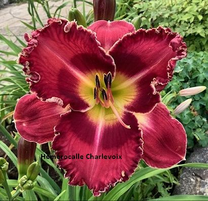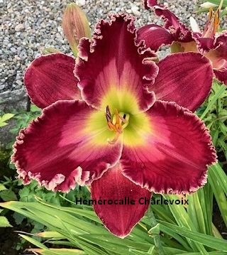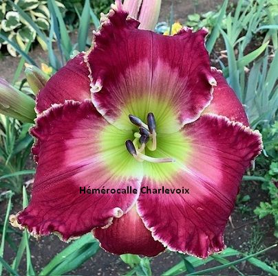 Grande fleur prune foncé, halo bourgogne très foncé, coeur étoilé jaune orangé et vert. Fertile