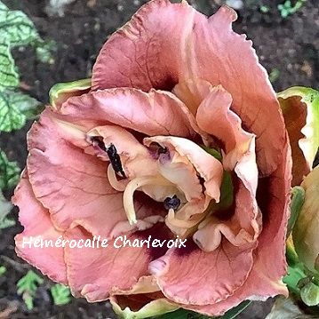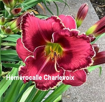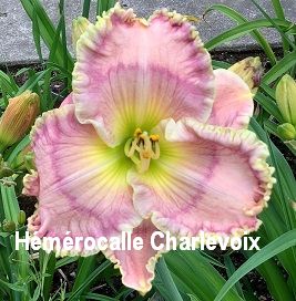 Épatante grande fleur rose foncé, coeur et bordure rouge foncé, fine bordure des pétales blanche, coeur vert. Florifère et fertile. |