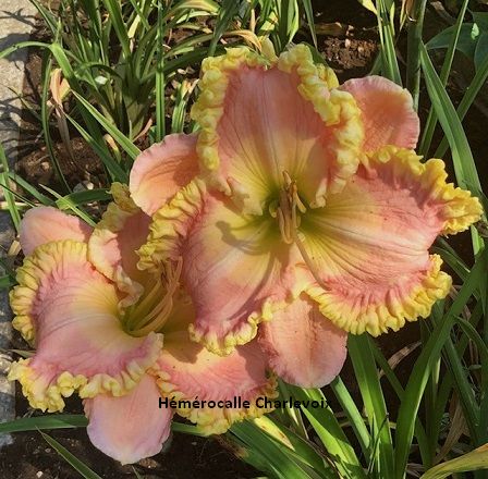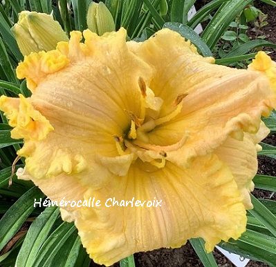 Grande fleur jaune avec bordure frisée, cœur vert. Fertile. |