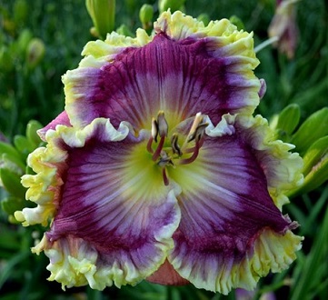 boutons floraux 35. Grande fleur lilas pourpre, oeil et double bordure pourpre avec dents blanches, coeur vert lime. Fertile. |