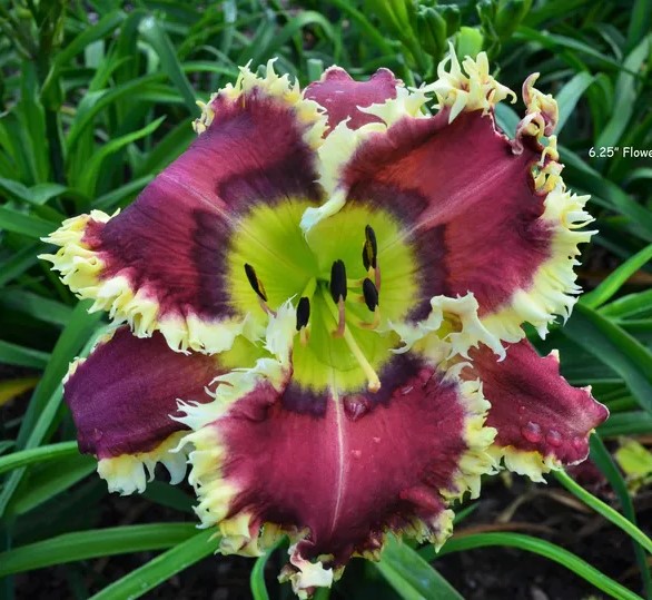 25 boutons floraux. Fleur combinée de dents avec un motif coloré en charbon de bois foncé et prune. La gorge est verte foncée, bordure avec tentacules blanches. Fertile dans les deux sens. |