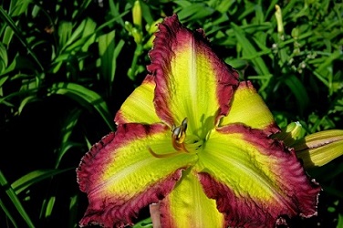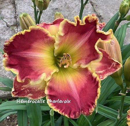 Grande fleur rouge cerise, halo rose, bordure frisée, cœur vert. Fertile. |