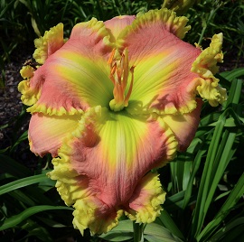 Hauteur 32, Fleur 8,5, Boutons floraux 30. Grande fleur épaisse rose bubble gum, propre et riche, double centre vert olive, bordure frisée et dorée. Fertile. |