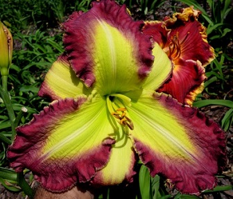 Hauteur 34, Fleur 7,5, Boutons floraux 35. Grande fleur rouge, oeil rouge foncé, double substance, gorge verte céleri, bordure frisée. Fertile. |