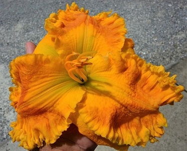 Hauteur 32, Fleur 9, Boutons floraux 25. Gigantesque orange Valencia, gorge côtelée vert olive, bord des pétales le plus extrême à volants sculptés or 24 carats soupoudré de diamants. Fertile dans les deux sens. |