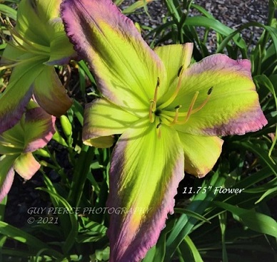 Hauteur 30, Fleur 11,75, Boutons floraux 25. Très grande fleur lilas, coeur vert et lilas rose, très odorante. Fertile. |